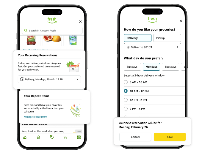 - Amazon Fresh introduced Recurring Reservations, allowing customers to set up weekly grocery deliveries or pickups in advance, complemented by a Repeat Items feature for automating regular purchases.